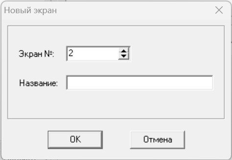 Для создания нового экрана нажмите кнопку «Новый» на панели списка экранов (1). Откроется окно создания нового экрана, в котором необходимо задать имя экрана и его номер. Обратите внимание, что использование номера уже существующего экрана запрещено.