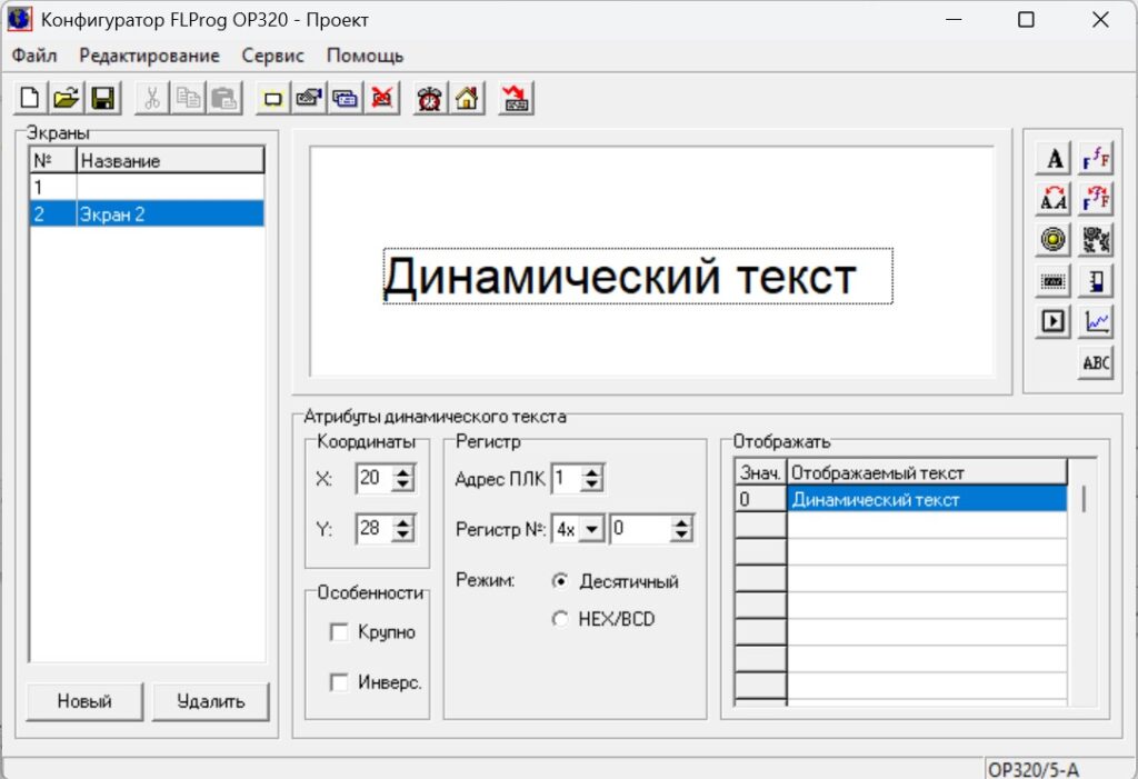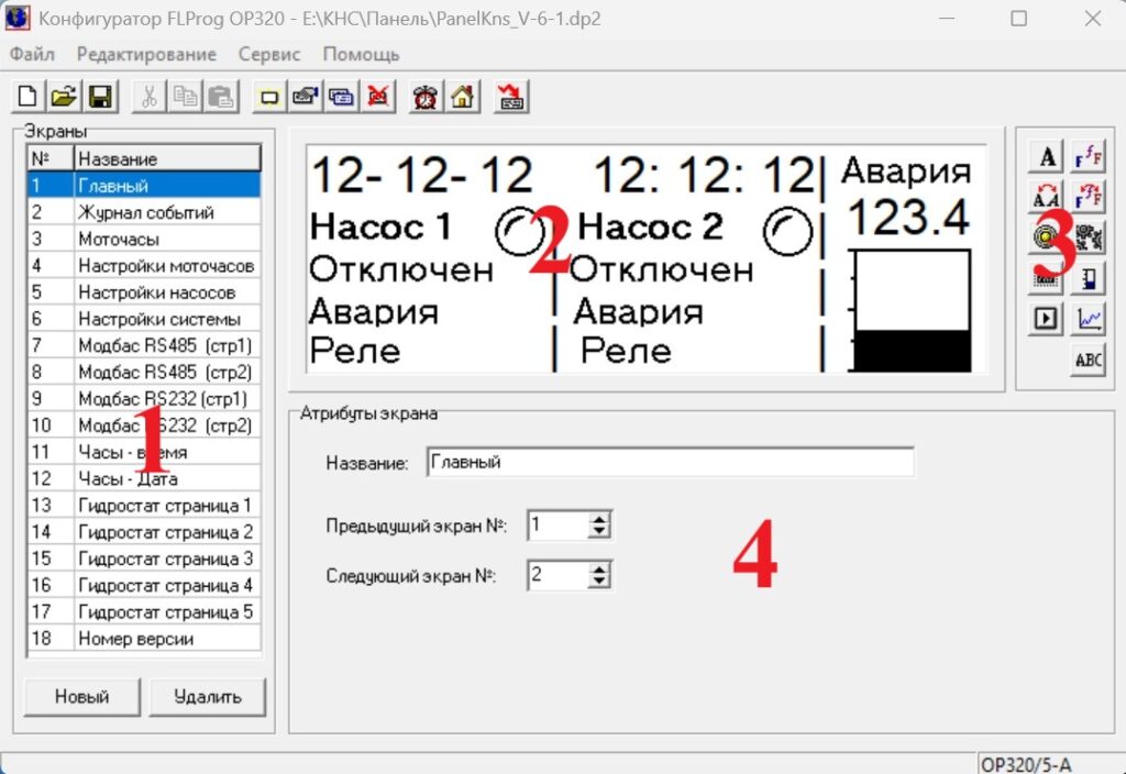 Конфигуратор FLProg OP320 позволяет формировать и сохранять пользовательские экраны, отображаемые на дисплее панели OP320 в процессе эксплуатации, и настраивать обмен данными между панелью и ПЛК (или другим устройством) по протоколу Modbus.