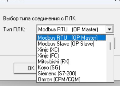 Программа поддерживает множество различных контроллеров, но для работы с контроллерами FLE необходимо выбрать абстрактные типы Modbus RTU или Modbus Slave в зависимости от того, в каком качестве будет выступать панель — мастера или слейва соответственно.