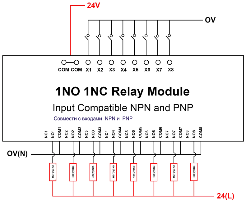 | Индикация: | Когда вход «COM» на 0 В «X» на 24 В, светодиод горит красным (светодиод COM» на 24 В горит синим) |