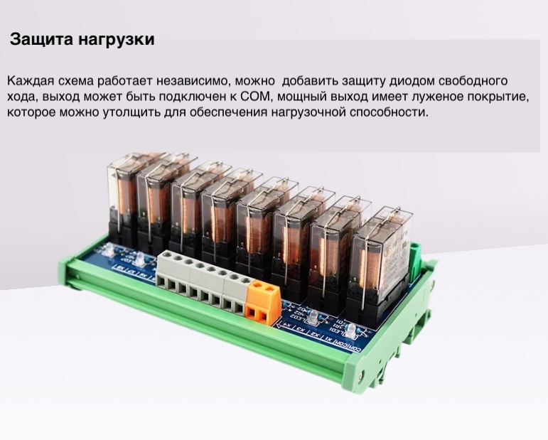 ➥Питание: Необходимо обеспечить достаточную мощность источника питания 24V DC для одновременного срабатывания всех 8 реле (суммируйте токи катушек).